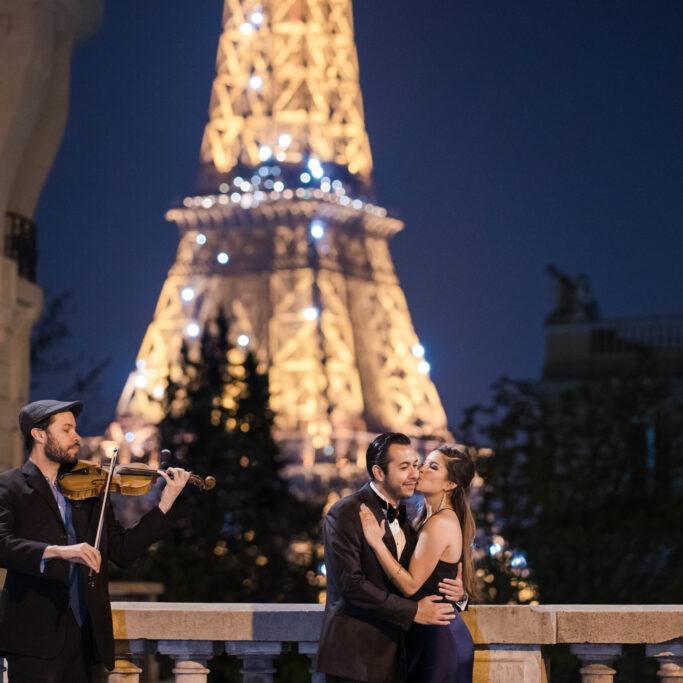 Magical proposal: an illuminated Eiffel Tower with a violinist